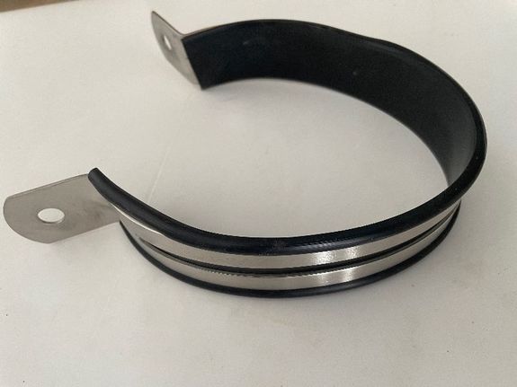 Bride de silencieux oval en inox. Position du silenceux : verticale. Livré avec son joint caoutchouc noir.