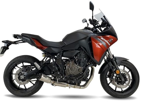La sortie de gaz est en carbone, le corps du silencieux est en inox , finition Titane look.